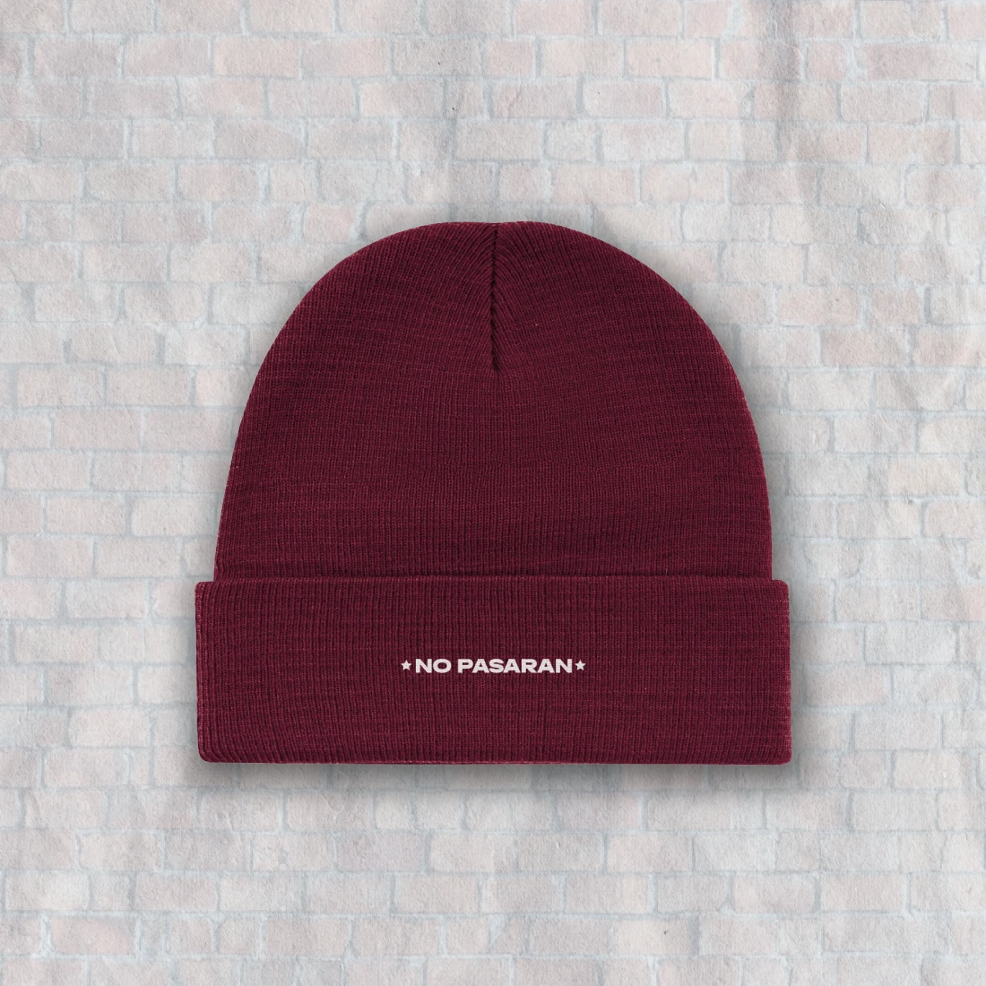 Burgunder-farbene Wollmütze aus 100% Acrylfasern mit weiß gesticktem No Pasaran Schriftzug mittig auf der Vorderseite.